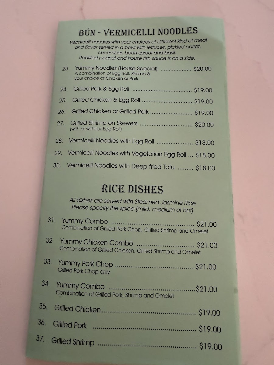 - Bun - Vermicelli Noodles: Try the House Special Yummy Noodles, a delightful combination of shrimp, chicken skewers, and egg rolls.