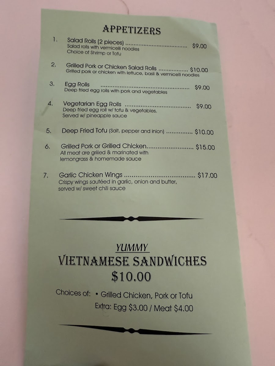 - Appetizers: Start your meal with crispy Garlic Chicken Wings or fresh Salad Rolls featuring shrimp, BBQ pork, or tofu.